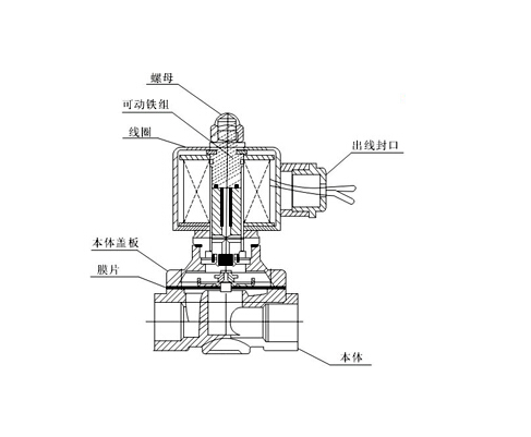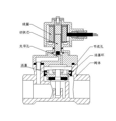 線(xiàn)圈通電后由于吸力作用,動(dòng)鐵芯下移,把副閥閥塞壓下,副閥關(guān)閉,主閥閥杯內壓力上升,當壓力升到一定值時(shí),主閥閥杯的上下壓差一樣,由于電磁力作用,動(dòng)鐵芯失去主閥閥杯下,壓緊主閥閥座,閥門(mén)關(guān)閉。線(xiàn)圈斷電時(shí),電磁吸力為零,副閥閥塞和支鐵芯由于彈簧作用向上提起,副閥打開(kāi),主閥閥杯上的流體經(jīng)副閥流走,減少了作用在主閥閥杯上的壓力,當主閥閥杯上的壓力減少到一定值時(shí),利用壓差把主閥閥杯推起,主閥打開(kāi),介質(zhì)流通。