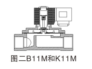 該閥代號M系列,依據膜片運動(dòng)封腔泄壓設計,閥分為常閉型和常開(kāi)型兩種。原理:常閉型(常態(tài),呈關(guān)閉狀態(tài)),當線(xiàn)圈通電時(shí),產(chǎn)生電磁力使動(dòng)鐵芯和靜鐵芯吸合,隨著(zhù)動(dòng)鐵芯上移,直拉開(kāi)啟膜片上小閥口,在卸流卸壓的同時(shí),經(jīng)過(guò)中間彈簧復拉提升密封膜片,使膜片向上運動(dòng)從而開(kāi)啟主閥,介質(zhì)通過(guò)。當線(xiàn)圈斷電時(shí),電磁力消失,此時(shí)動(dòng)鐵芯在復位彈簧和介質(zhì)壓力的同時(shí)作用下,依次關(guān)閉主閥,介質(zhì)斷。復拉膜片結構,可實(shí)現零壓差啟動(dòng)。常開(kāi)型工作原理正好相反。如圖二: B11M和K11M電磁閥。