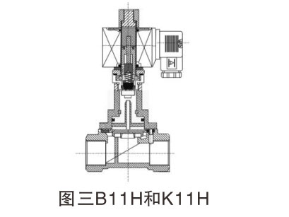 該閥代號H系列,依據活塞運動(dòng)封腔泄壓設計,閥分為常閉型和常開(kāi)型兩種。原理:常閉型(常態(tài)呈關(guān)閉狀態(tài)),當線(xiàn)圈通電時(shí),產(chǎn)生電磁力使動(dòng)鐵芯和靜鐵芯吸合,隨著(zhù)動(dòng)鐵芯上移,直拉開(kāi)啟活塞上小閥口,在卸流卸壓的同時(shí),經(jīng)過(guò)中間彈簧復拉提升密封活塞,使活塞閥芯向上運動(dòng)從而開(kāi)啟主閥,介質(zhì)通過(guò)。當線(xiàn)圈斷電時(shí),電磁力消失,此時(shí)動(dòng)鐵芯在復位彈簧和介質(zhì)壓力的同時(shí)作用下,依次關(guān)閉,斷電時(shí),電磁力消失,此時(shí)動(dòng)鐵芯在復位彈簧和介質(zhì)壓力的同時(shí)作用下關(guān)閉主閥,介質(zhì)斷。復拉活塞結構,可實(shí)現零壓差啟動(dòng)。常開(kāi)型工作原理正好相反。如圖三: B11H和K11H電磁閥。